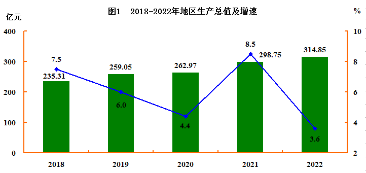 初步核算,全年实现地区生产总值(GDP)314.85亿元,比上年增长3.6%。其中,第一产业增加值39.54亿元,增长4.1%;第二产业增加值125.87亿元,增长4.1%;第三产业增加值149.44亿元,增长3.1%。第一产业增加值占地区生产总值的比重为12.5%,第二产业增加值比重为40.0%,第三产业增加值比重为47.5%。全年人均地区生产总值124942元,增长4.2%。