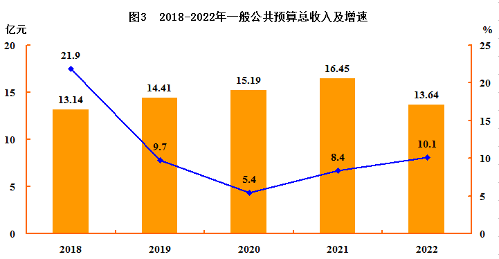 全年一般公共预算总收入13.64亿元,扣除留抵退税因素后比上年增长10.1%,其中,地方一般公共预算收入10.59亿元,扣除留抵退税因素后增长23.7%。一般公共预算支出26.44亿元,增长2.8%。全年税收收入13.11亿元,下降15.1%。
