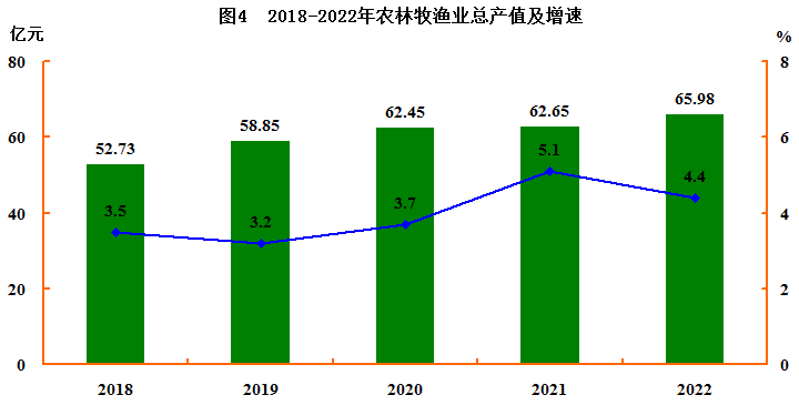 全年农林牧渔业完成总产值65.98亿元,比上年增长4.4%,其中,农业产值37.47亿元,增长3.5%;林业产值8.80亿元,增长4.2%;牧业产值15.51亿元,增长8.2%;渔业产值2.49亿元,增长3.6%;农林牧渔服务业产值1.72亿元,增长4.6%。农、林、牧、渔及服务业产值比例为56.8: 13.3 : 23.5: 3.8: 2.6。粮食种植面积14.14万亩,增长0.3%,其中,稻谷种植面积12.64万亩,增长0.3%。烟叶种植面积1.73万亩,增长0.7%;油料种植面积0.55万亩,增长1.9%;花卉苗木种植面积2.28万亩,增长0.4%。