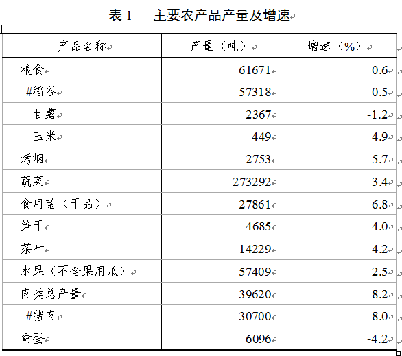 粮食产量6.17万吨,比上年增长0.6%,其中,稻谷产量5.73万吨,增长0.5%。蔬菜产量27.33万吨,增长3.4%;茶叶产量1.42万吨,增长4.2%;食用菌产量2.79万吨,增长6.8%;笋干产量4685吨,增长4.0%。