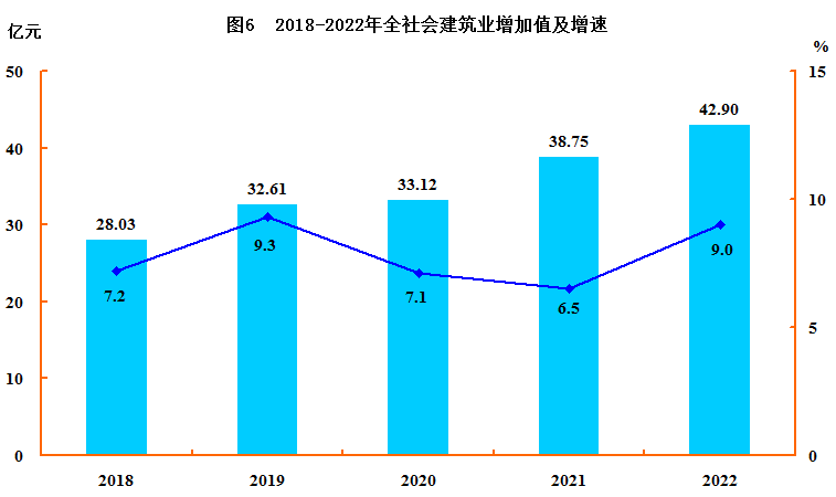 全年全社会建筑业增加值42.90亿元,比上年增长9.0%。全市54家资质等级建筑业企业完成产值76.93亿元,增长12.6%;新签建筑合同额76.8亿元,增长9.2%。
