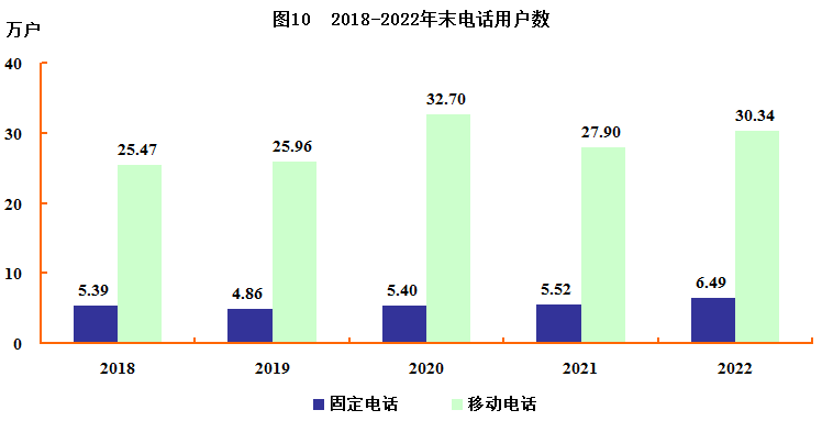 全年邮电业务总量9871万元,其中,邮政业务总量3653万元,电信业务总量6218万元。年末宽带用户10.54万户,固定电话用户6.49万户,移动电话用户30.34万户。