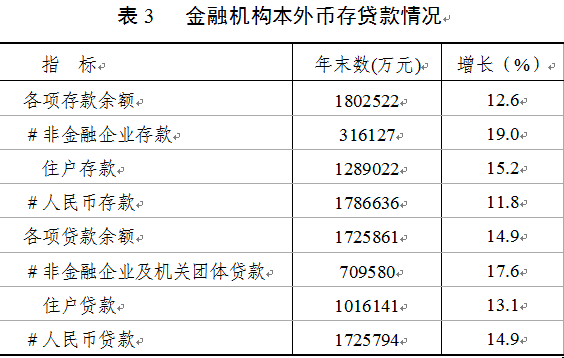 年末金融机构本外币各项存款余额180.25亿元,比上年末增长12.6%;金融机构本外币各项贷款余额172.59亿元,比上年末增长14.9 %。