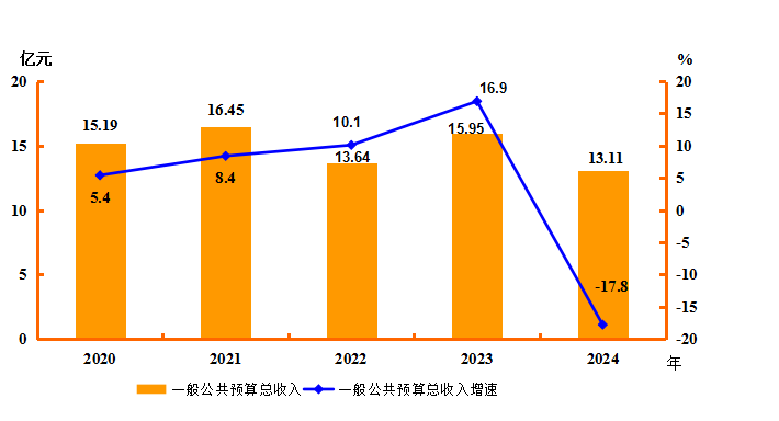 全年一般公共预算总收入13.11亿元,比上年下降17.8%,其中,地方一般公共预算收入9.28亿元,下降16.9%。一般公共预算支出31.31亿元,增长6.6%。全年税收收入9.86亿元,下降16.6%。