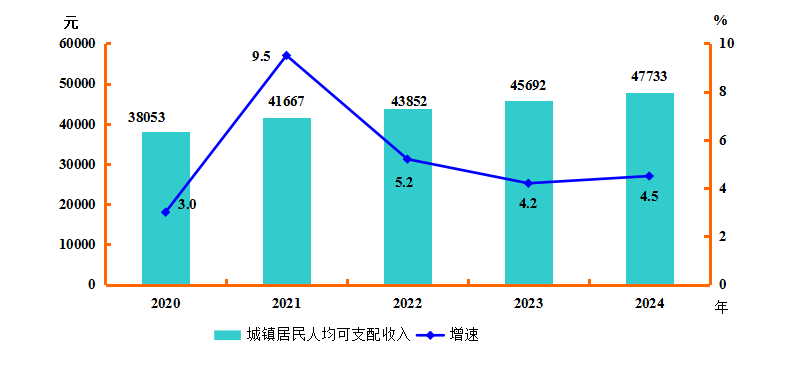 图9 2020-2024年城镇居民人均可支配收入及增速