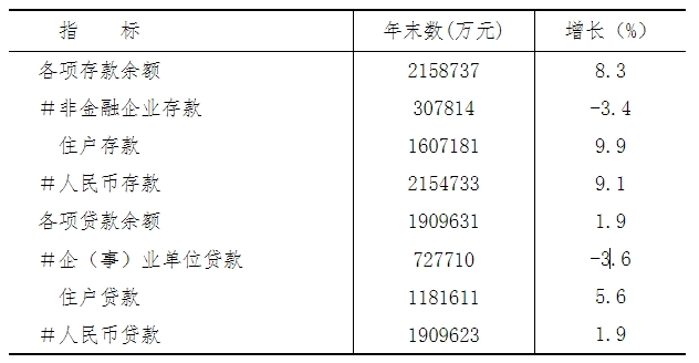 年末金融机构本外币各项存款余额215.87亿元,比上年末增长8.3%;金融机构本外币各项贷款余额190.96亿元,比上年末增长1.9%。