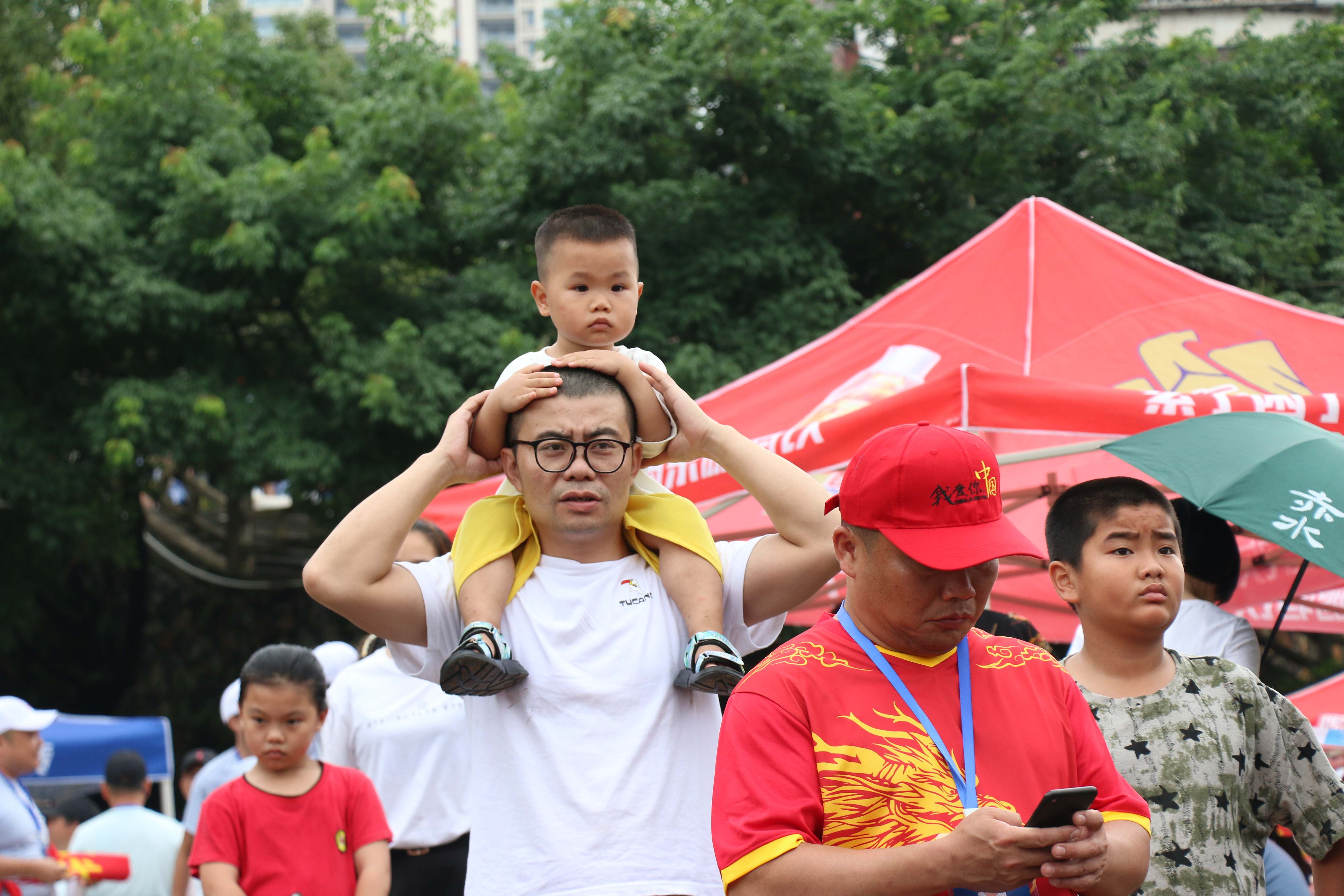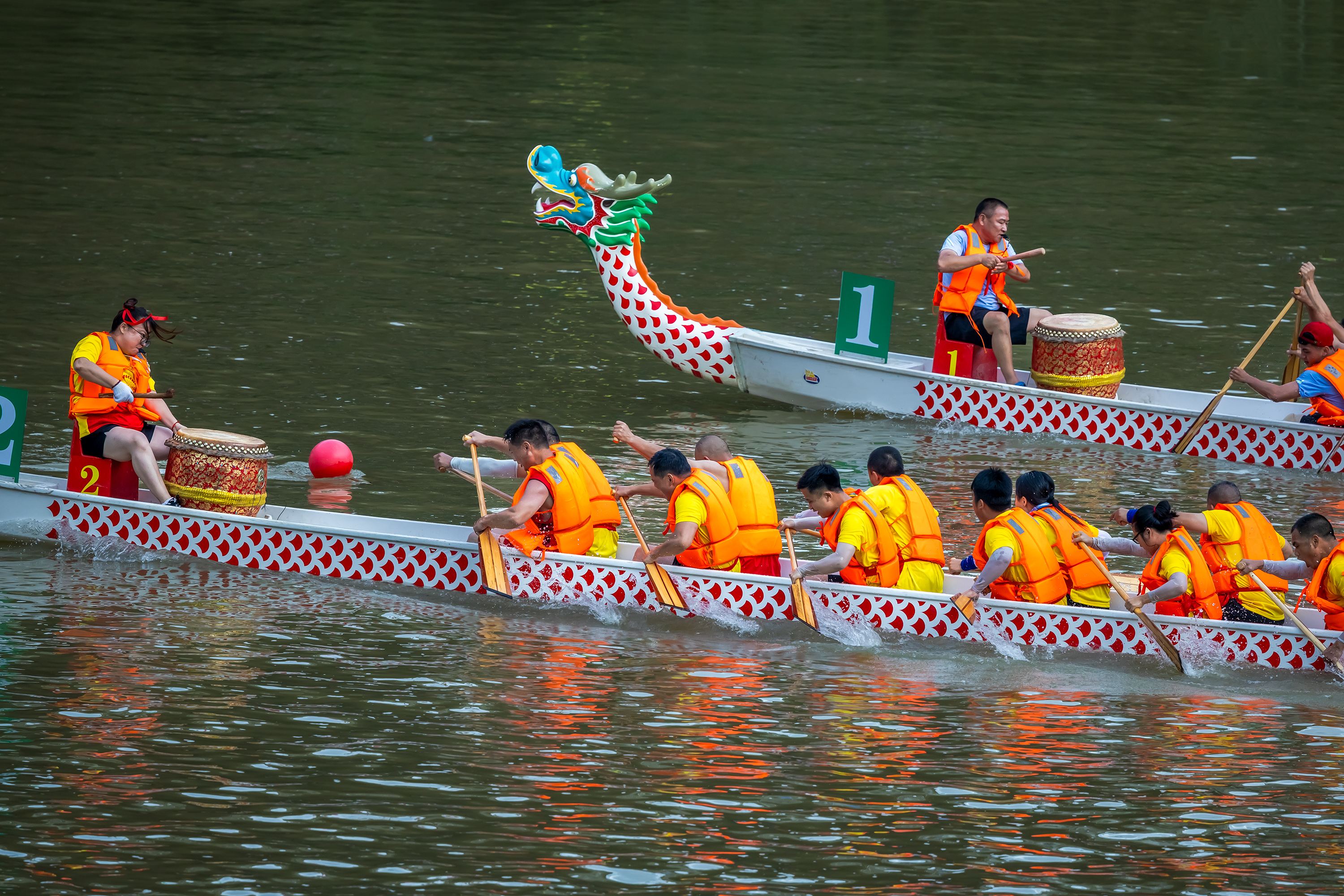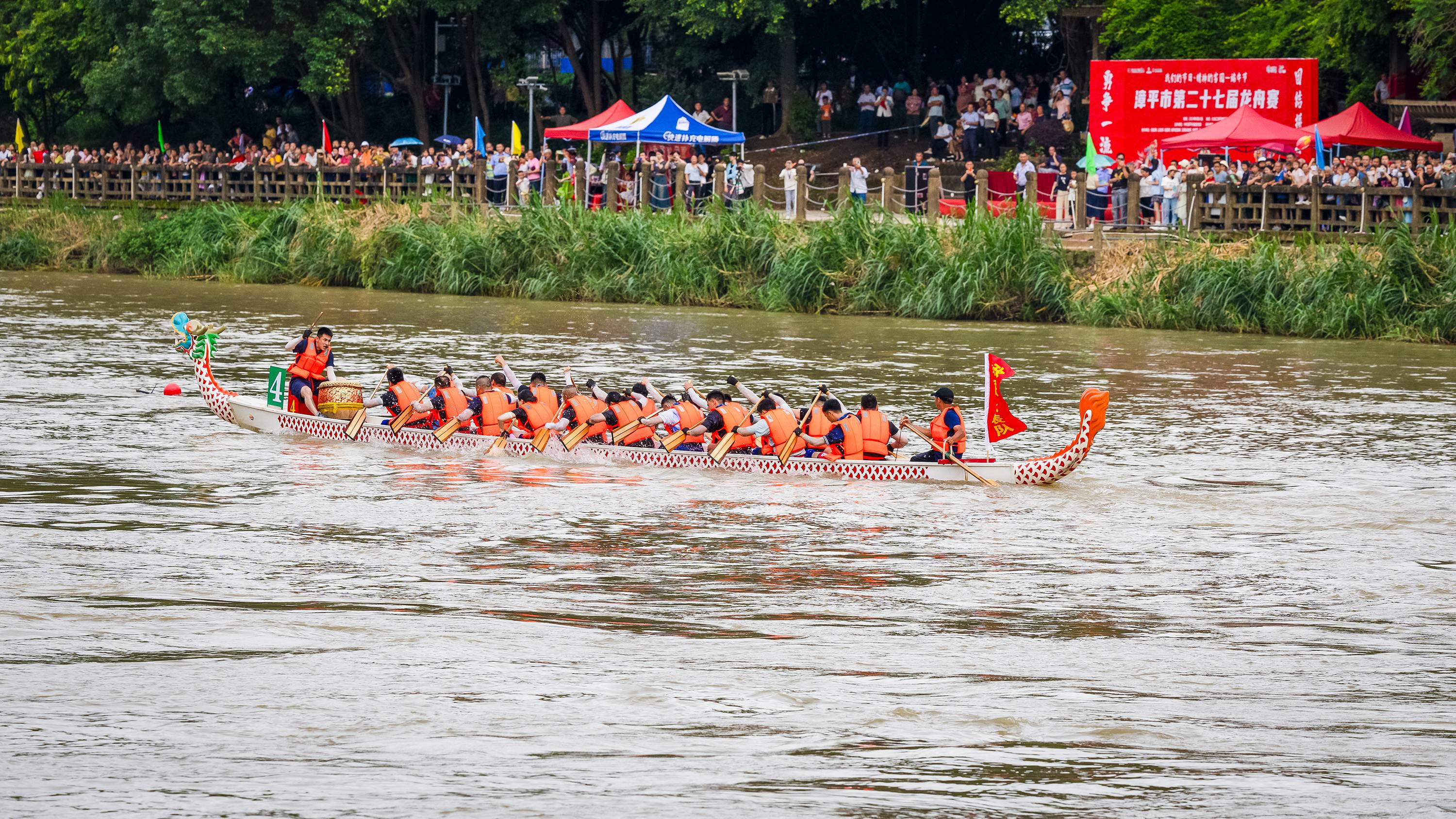 岸上人声鼎沸,水上舟桨翻飞。随着比赛发令声响,一条条龙舟如利箭般飞驰,参赛选手配合着鼓点,热情高涨,奋力下腰、提桨破水,动作整齐划一、气势如虹,在江面上劈波斩浪、你追我赶,奋力划向终点。岸上驻足观看的市民被选手的气势和激情所带动和吸引,有的高举手机,记录下龙舟竞渡壮观场面,有的呐喊助威、喝彩连连。霎时间,水声、锣鼓声、呐喊声、欢呼声此起彼伏,声声直击人心,将过节的氛围感直接拉满。