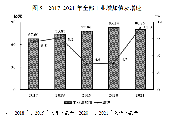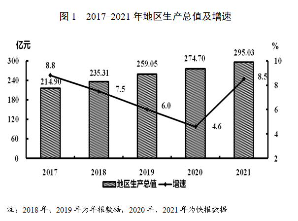初步核算,全年实现地区生产总值295.03亿元,增长8.5%。其中,第一产业增加值37.48亿元,增长4.6%;第二产业增加值119.00亿元,增长9.8%;第三产业增加值138.54亿元,增长8.6%。三次产业结构由2020年的13.6 : 42.8 : 43.6调整为2021年的12.7: 40.3 : 47.0。