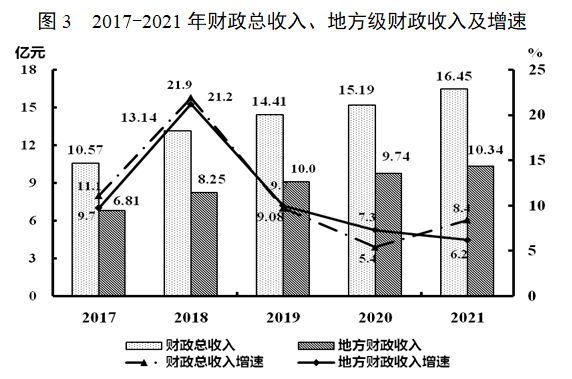 全年财政总收入16.45亿元,增长8.4%,其中,地方级财政收入10.34亿元,增长6.2%;一般公共预算支出25.71亿元,下降1.3%。全市税收收入15.01亿元,增长15.4%。