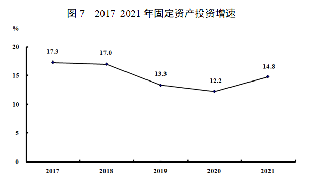 全年固定资产投资增长14.8%。按产业看,第一产业投资增长34.9%;第二产业投资增长25.9%,其中,工业投资增长25.9%;第三产业投资下降1.9%,三次产业投资比例为9.8 : 53.9: 36.3。分领域看,高技术产业投资下降32.8%,先进制造业投资增长89.3%,民间投资增长31.0%,基础设施投资下降28.5%,交通运输投资下降40.2%。
