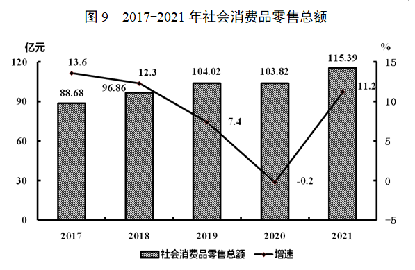 全年社会消费品零售总额115.39亿元,增长11.2%。全年限额以上网络零售额4.06亿元,增长36.2%。按规模看,限额以上社会消费品零售总额44.38亿元,增长12.2%;限额以下社会消费品零售总额71.01亿元,增长10.5%。按行业看,全年批发业销售额165.84亿元,增长22.3%;零售业销售额104.41亿元,增长19.9%;住宿业营业额1.94亿元,增长11.8%;餐饮业营业额16.44亿元,增长30.4%。全年新增21家限额以上批发零售住宿餐饮业企业,全市限额以上批发零售住宿餐饮业企业229家。