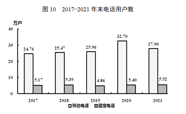 全年邮电业务总量9340万元,其中,邮政业务总量3665万元,下降22.2%;电信业务总量5675万元,增长6.8%。年末宽带用户11.17万户,下降7.7%;固定电话用户5.52万户,增长2.2%;移动电话用户27.90万户,下降14.7%。