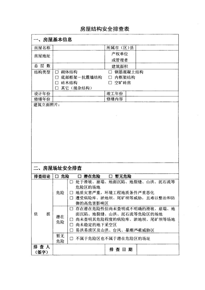 第五条 房屋场址安全排查应重点检查房屋遭受洪涝、地质灾害、采空区、台风以及病险库、淤地坝、尾矿坝等的威胁情况。