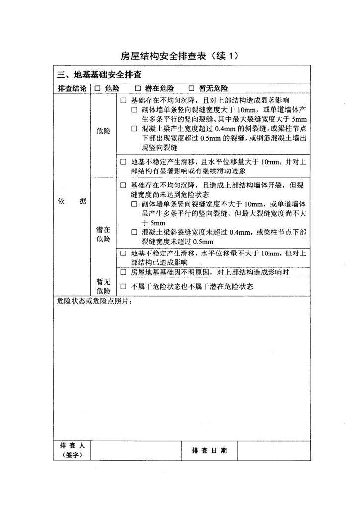 第十条~第十三条 地基基础的安全排查系参考《危险房屋鉴定标准》JGJ 1 25—99(2 004年版)制定。只要地基基础存在不均匀沉降或滑移(可能是由于施工降水、基坑支护不当或是地基处理不当引起),对上部结构造成“显著影响”处于危险状态时,房屋结构即评定为危险房屋;若地基基础存在不均匀沉降或滑移,对上部结构造成“影响”,且有继续发展迹象,但尚不属于危险状态时,一律评定为潜在危险房屋。