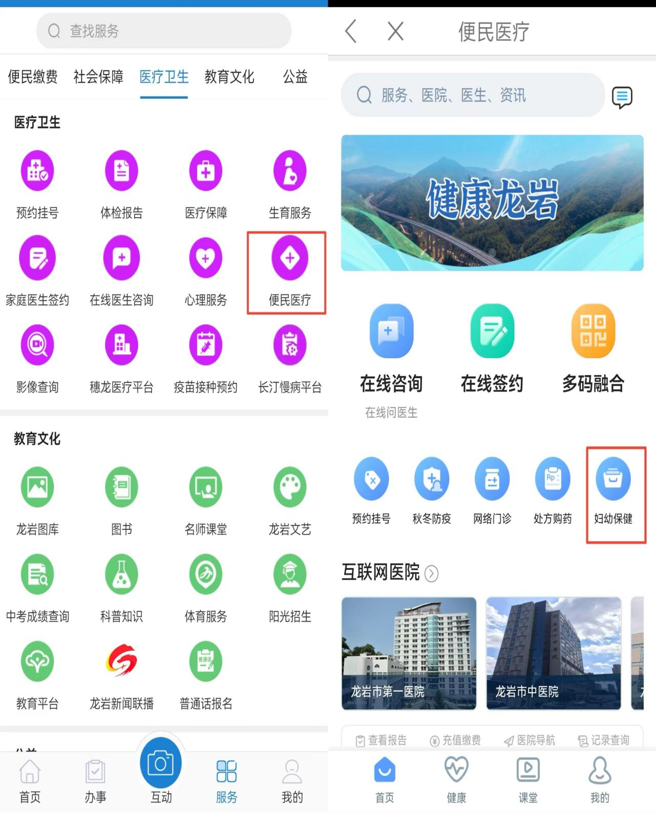 e龙岩APP---服务---医疗卫生---便民医疗---妇幼保健---婚前检查预登记(完成基本信息登记,随后及时到辖区妇幼保健院进行婚前检查)。