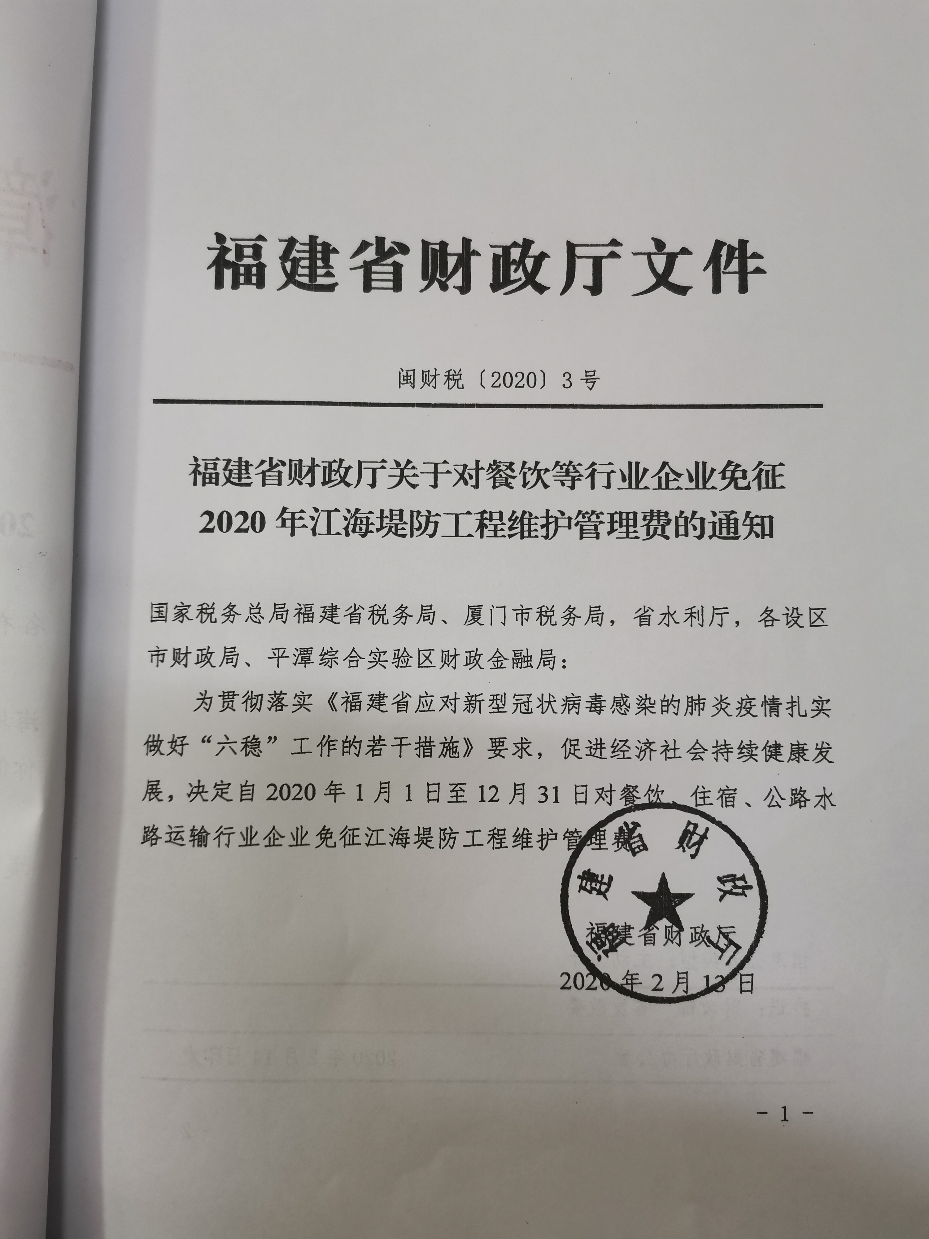 附:《福建省财政厅关于对餐饮等行业企业免征2020年江海堤防工程维护管理费的通知》