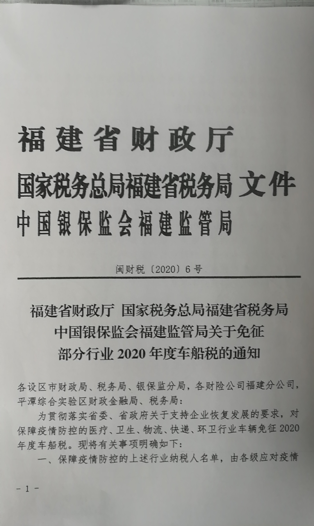 附件:《福建省财政厅 国家税务总局福建省税务局 中国银保监会福建监管局关于免征部分行业2020年度车船税的通知》(闽财税〔2020〕6号)