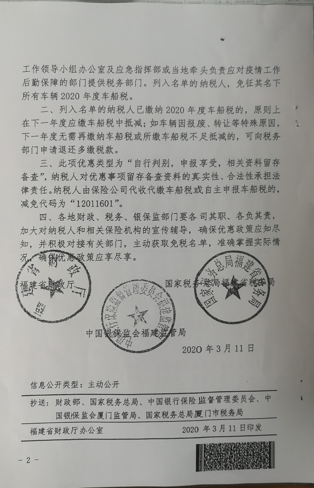关于转发《福建省财政厅 国家税务总局福建省税务局中国银保监会福建监管局关于免征部分行业2020年度车船税的通知》的通知